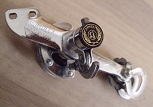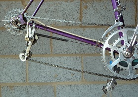 But there are problems. One is that my Ellis-Briggs frame doesn’t have the two-hole fixing tab that this derailleur requires. Another is that the derailleur was not complete – there should be a long external spring, anchored to the frame, to maintain chain tension. But my favourite seller, Reperages, came to the rescue! I managed to buy from them an alloy gear hanger that replaces the derailleur mounting plate and can be bolted to the chainstay. It means I don’t have to get the frame altered.