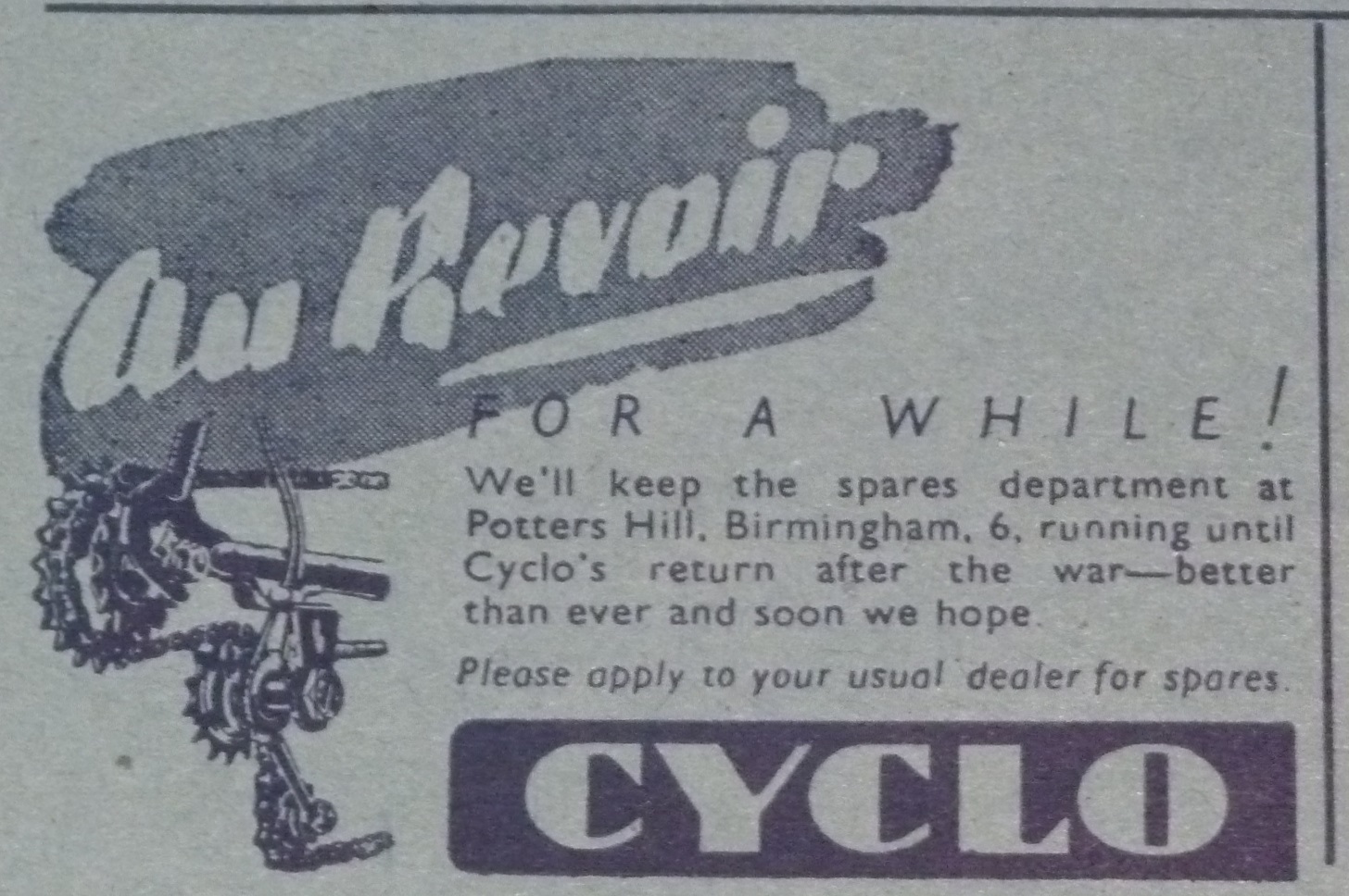 I came across some old cycling magazines from the 1940s and 50s and hoped to find some ideas about components for the restoration of my reserve bike: the 1942 Claud Butler. These things are fascinating, especially the wartime numbers. The ads show some of the component manufacturers, like the Cyclo gear company, closing down for the duration: